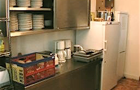 In der Küche befindet sich ein Industrieherd sowie eine Geschirrspülmaschine. Kaffeemaschinen, Kühlschrank, Warmhalteplatten gehören ebenso zur Ausstattung, wie das Geschirr für ca. 25 Personen. Eine Durchreiche zum Aufenthaltsraum erleichtert hier die Zurichtung der Mahlzeiten.
